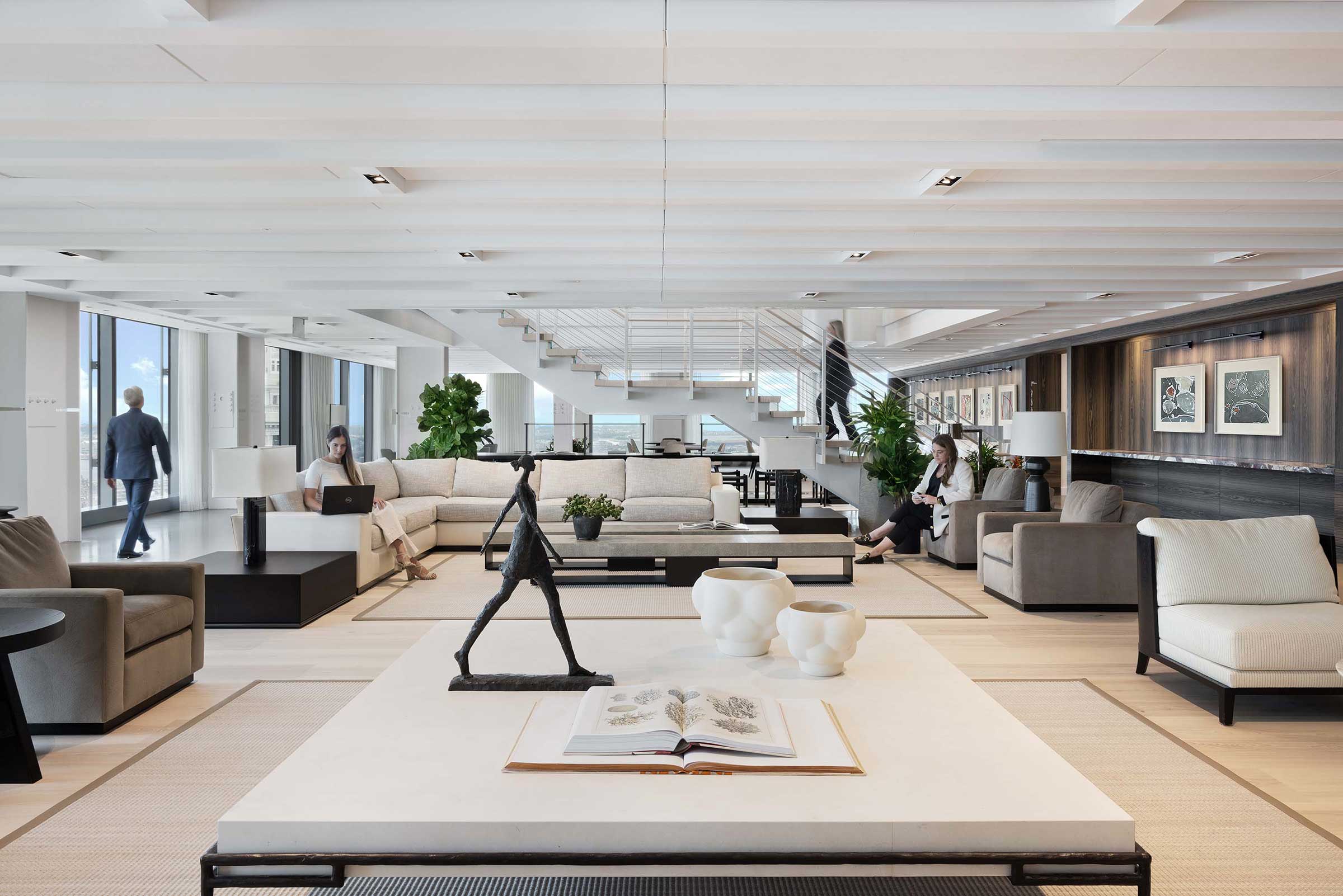 - The space features a welcoming reception/co-working space exposing three sides of the building for access to the spectacular views and private outdoor deck overlooking Post Office Square and the Boston Harbor.